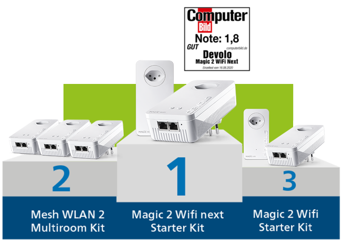 Sowohl das Magic 2 WiFi next Starter Kit als auch unser neues Mesh WLAN 2 Multiroom Kit konnten im Computer Bild Test auf voller Linie überzeugen. So betitelt Computer Bild den Magic 2 WiFi next als "derzeit beste[n] Powerline-Adapter". Er überzeugte mit hohen Übertragungsraten und "setzte so neue Massstäbe".